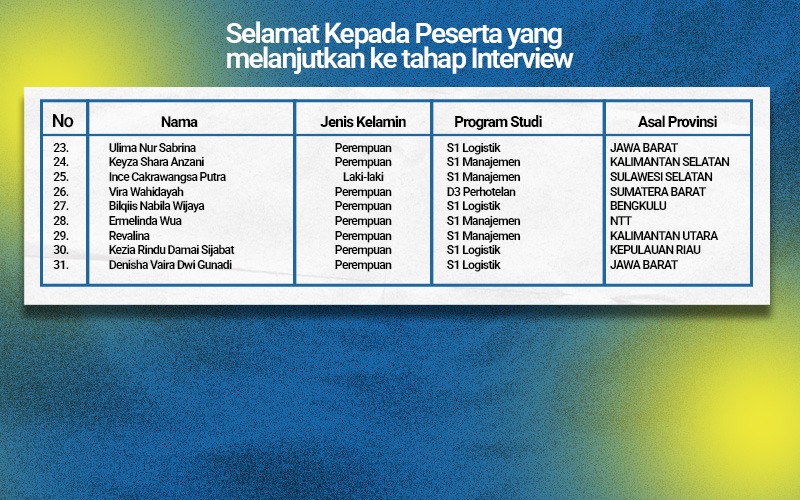 Peserta yang dinyatakan lolos Tes TPA & Psikotes diwajibkan mengikuti tahapan seleksi berikutnya, yaitu Interview sesuai jadwal yang ditetapkan, yaitu pada :
